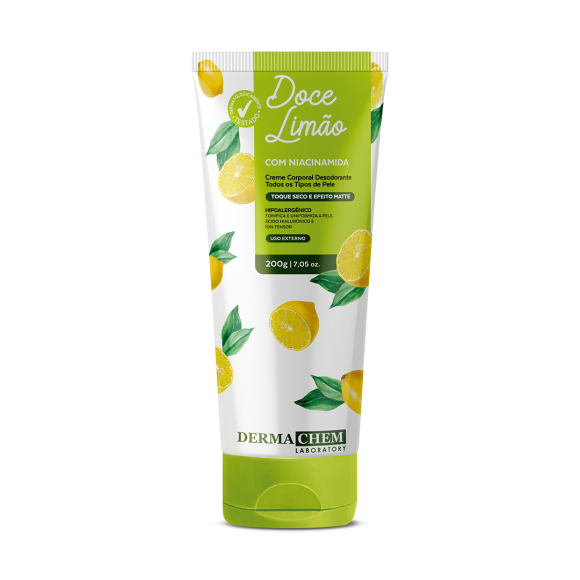 O Creme Corporal Desodorante Doce Limão DERMA CHEM Laboratory, é um desodorante corporal desenvolvido para deixar a sua pele perfumada e hidratada por muito mais tempo. Formulado com Ácido Hialurônico, Niacinamida, Algas, Íons Tensores e outros ativos ricos em lignanas que juntos são capazes de proteger a pele dos radicais livres, tonificar, promover o efeito antipoluição, protetor da luz azul e revitalizar a sua pele. Indicado para todos os tipos de pele.