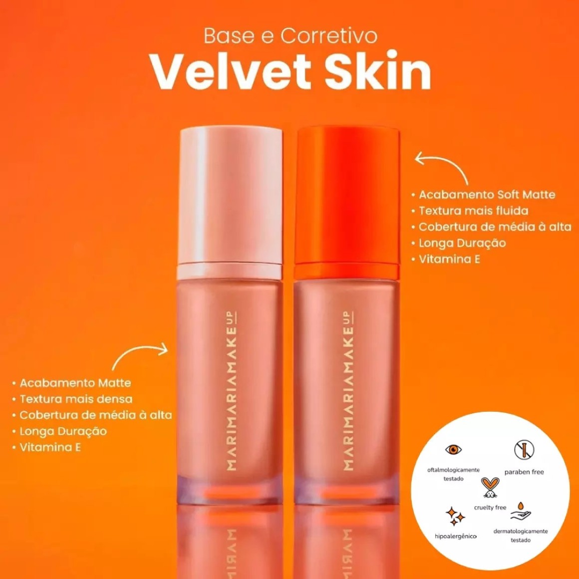 A nova Base e Corretivo Velvet Skin combina um acabamento aveludado e proporciona cobertura média à alta, possui longa duração e ajuda a minimizar as imperfeições.
