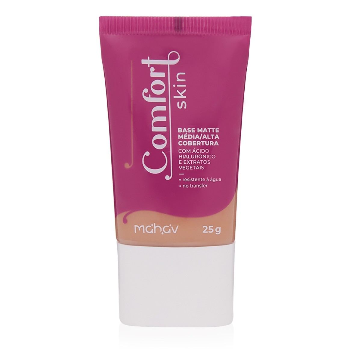 Com acabamento matte e cobertura média/alta, a BASE MATTE COMFORT SKIN MAHAV foi formulada com ácido hialurônico e extratos vegetais que mantêm o viço da pele, garantindo mais durabilidade à maquiagem, resultando em um acabamento de pele saudável e bem uniforme.