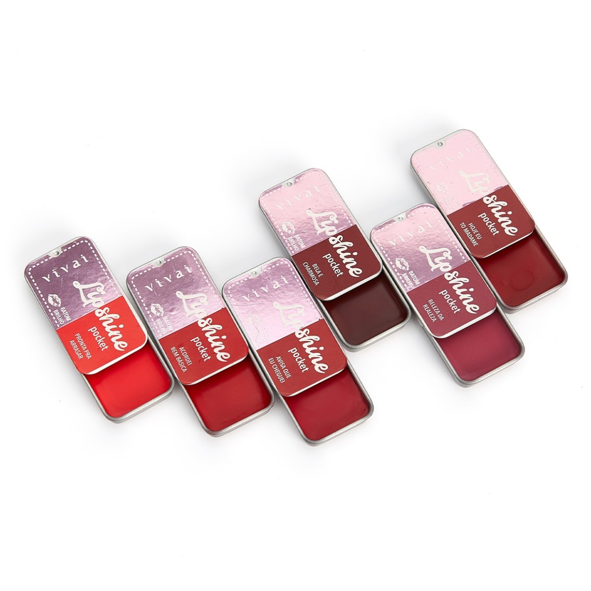 O Batom Pocket Lip Shine Vivai possui 6 cores LINDÍSSIMAS que variam entre rosa e vermelho, ambas prometem hidratar e pigmentar, deixando seus lábios ainda mais lindos e prontos pra qualquer ocasião. Ele possui um brilho perfeito e uma embalagem feita de lata super fofa, que serve pra você levar pra qualquer lugar e também pra deixar de enfeite na sua penteadeira!