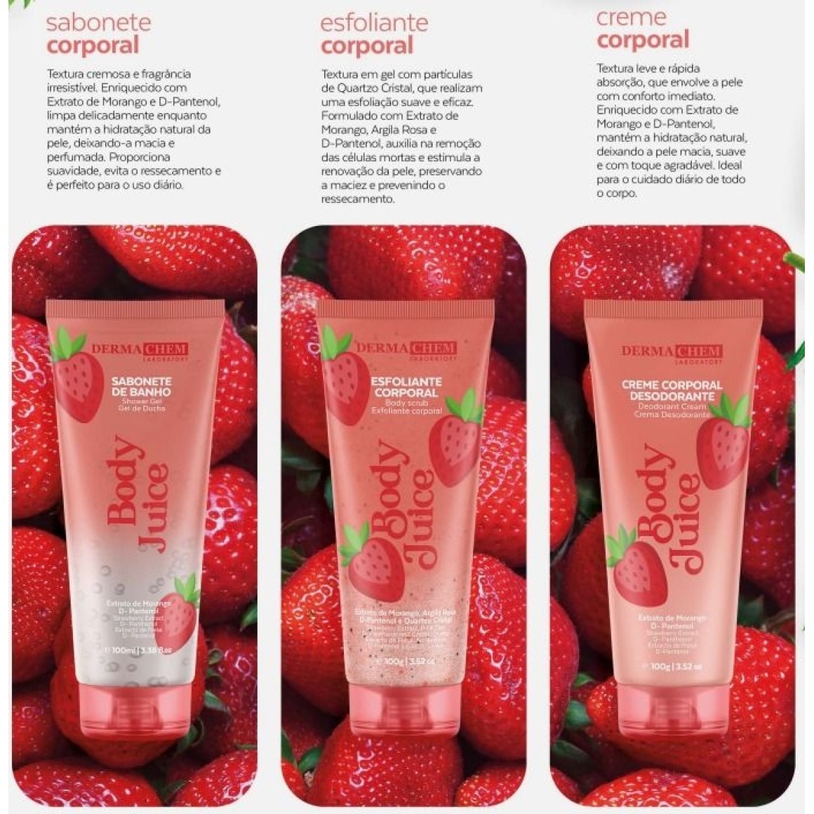 Textura cremosa e fragância irresistível. Enriquecido com extrato de morango e D-Pantenol, limpa delicadamente enquanto mantém a hidratação natural da pele, deixando-a macia e perfumada. Proporciona Suavidade, evita o ressecamento.