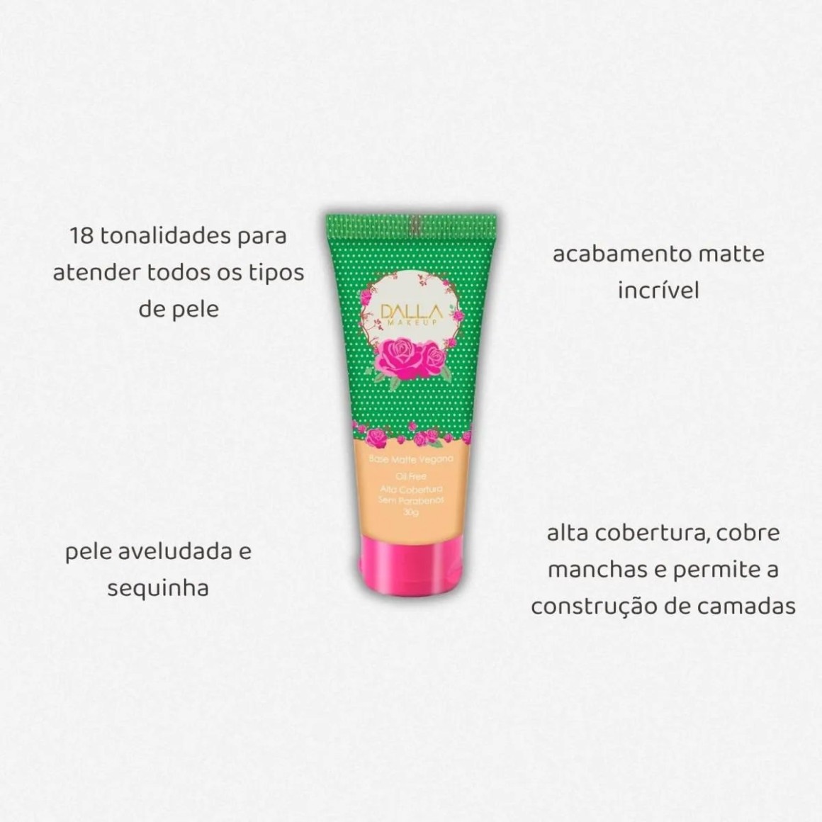 A Base Líquida Matte de Alta Cobertura da Dalla Makeup é Oil Free e possui acabamento matte com toque aveludado, é fácil de aplicar e construir camadas e auxilia no disfarce de olheiras, poros e linhas de expressão. Tem longa duração, proporcionando uma pele perfeita por muito mais tempo. É uma base Vegana, ou seja, não tem ingredientes de origem animal em sua composição e, também, é Cruelty Free, não foi testada em animais. Disfarçando desde olheiras até pequenas imperfeições. É uma base que pode ser construída em camadas, para um efeito mais intenso. A Base Matte Oil Free Dalla Makeup, foi criada para atender diversos tons de peles.
