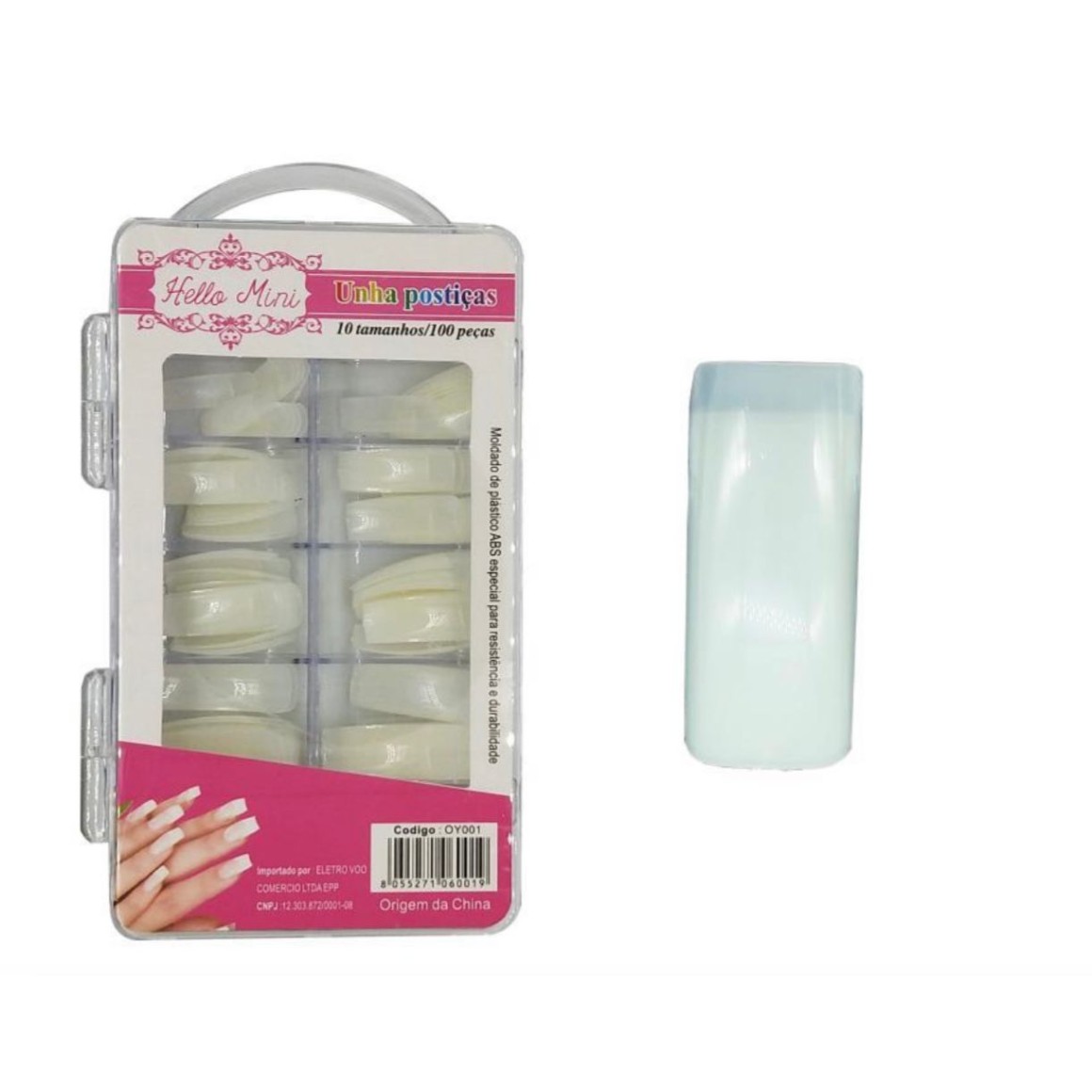 Características Técnicas - Modelo: OY001-6 - Tips Quadrada - Contém: Kit com 100 unhas postiças/10 tamanhos diferentes - Material: Plástico ABS de alta resistência e não trinca - Alonga e dá maior beleza e fino acabamento nas suas unhas - Os tamanhos são separados em compartimentos separados individuais para sua praticidade - Cola não inclusa