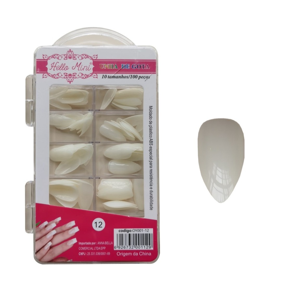 Características Técnicas - Modelo: OY001-12 - Unha Postiça Gota - Contém: Kit com 100 unhas postiças/10 tamanhos diferentes - Material: Plástico ABS de alta resistência e não trinca - Alonga e dá maior beleza e fino acabamento nas suas unhas - Os tamanhos são separados em compartimentos separados individuais para sua praticidade - Cola não inclusa
